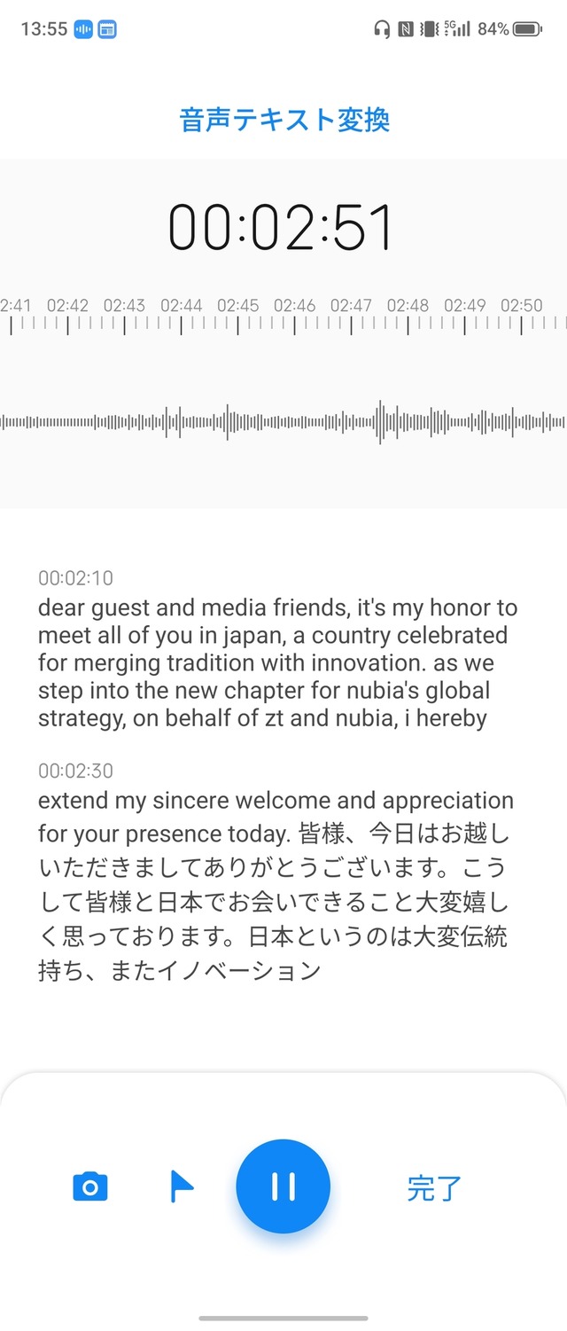 アプリ側にも音声や映像を残しておく機能はありますが、主催者側が有効にしているとは限りません。nubia AIの録音機能は、このような時に利用できます。画面収録で音を録ることができる端末はほかにもありますが、nubai Foldは、録音ボタンを画面上に重ねてくれるのでワンタッチでそれが可能。録音後、すぐに文字起こしできるのもAIならではでした。
