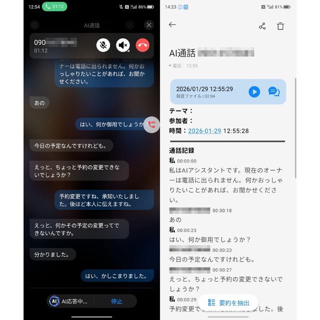 ▲AIが代わりに受け答えをしてくれるAI通話。会話後の記録を見ると、コミュニケーションが成立している