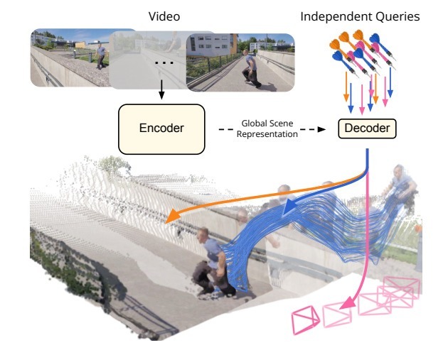 従来の手法では、奥行きの推定や動きの追跡、カメラ位置の特定などにそれぞれ別のAIモデルや複雑な計算プロセスを使う必要があり、処理が遅くなったり、断片的な結果になったりすることが課題でした。