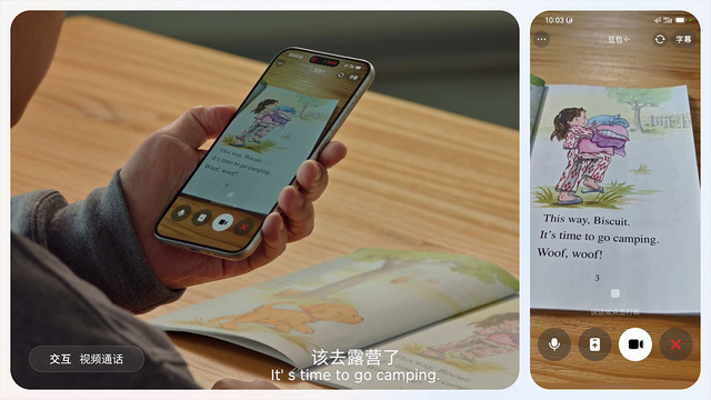 まずは簡単な操作から。英語の絵本を開き、英語の文字が書いてある部分を写しながら「英語と中国語で読み上げて」と指示できます。翻訳にも使える機能です。