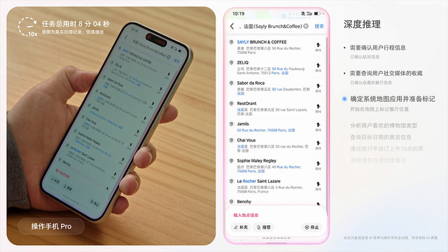 複雑な指示に対しても高い処理能力を発揮します。Duobaoの事例では、パリ旅行の計画作成をデモしています。まずはSNSに保存しておいたパリのレストランをピックアップして、地図上にピン止め。次にユーザーが「ゴッホが好き」というデータを持っていれば、「ゴッホの作品が展示されているオルセー美術館」を自動で選び出し、指定の時間にチケットを予約します。最後にすべての完了したタスクをメモ帳にまとめてユーザーに提示します。