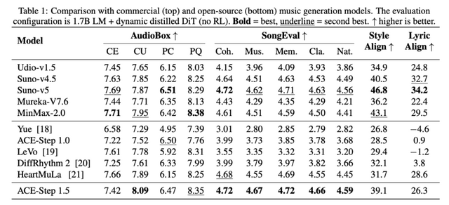 音の品質を評価するベンチマーク「AudioBox」ではACE-Step 1.5がSuno v5とほぼ互角で、曲としての美的品質を評価するベンチマーク「SongEva」ではACE-Step 1.5がSuno v5を上回りました。ただ、指定したスタイルや歌詞にどれだけ忠実に生成できるかの「Style Align」や「Lyric Align」ではSuno-v5が圧倒しました。