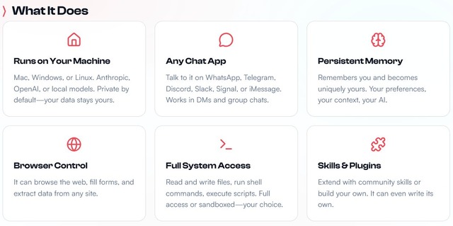 OpenClawはSlack、Discord、WhatsAppといったメッセージアプリを利用してユーザーと対話し、会話内容を蓄積し、さらにメッセージの送信やスクリプト・シェルコマンドなどの実行、スケジュール管理、ウェブサイトからの情報収集や抽出、ファイル操作などができ、使い込むに従ってユーザーに変わり様々なタスクをこなすシステムに育てていくことができるとのことです。