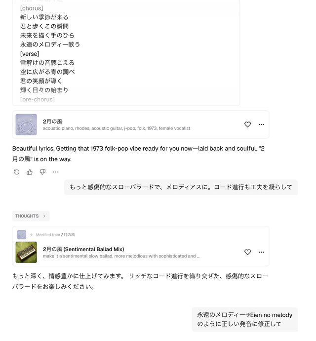 ですが、SunoやMurekaと比較できるように同じ歌詞で曲を進めていくと、これはLyria 3のせいなのか、だいぶ劣化していることが判明しました。