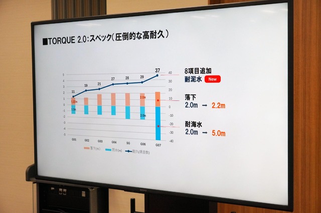 KDDIによると、主な開発テーマは3つ。1つがより耐久性を高めること。高耐久を示す試験項目は8つ追加され、全37のテストを追加。落下は2mから2.2mに、耐海水性は2mから5mへと耐久性能が上がっています。KDDIの担当者によると、ここ数世代はテスト項目数の伸びがゆるやかになっていたとのこと。