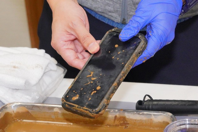 項目数をグラフ化しているところには思わず笑ってしまいましたが、この伸び悩みを解消し、圧倒的な高耐久を実現するためにTORQUE G07では項目数を一気に8つ増やしたといいます。その1つが、耐泥水。TORQUEはバッテリー交換が可能なため、泥が内部に入ってしまいますが、それを排出するスリット構造を設けています。