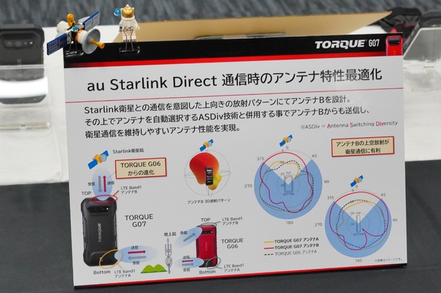 3つ目がKDDIならではで、au Starlink Directへの対応。TORQUE G06も、au Starlink Directには対応している一方で、利用できるのはメッセージサービスに限定されています。これに対し、TORQUE G07ではアンテナを改善。au Starlink Directでの、データ通信にも対応します。