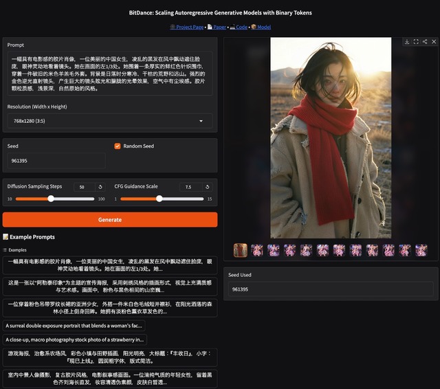従来のARモデルでは”1 tokenずつ”生成するため非常に遅かったが、BitDanceは独自のバイナリトークナイザー + 次パッチ拡散により一度に64トークンを予測。従来ARモデルより30倍以上高速化に成功している。パラメータ数は14B