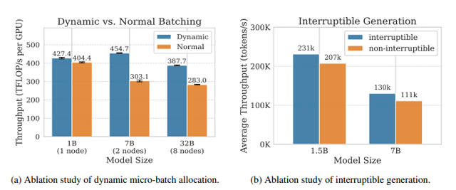 この待機時間をなくすため、研究チームは、文章の生成とモデルの学習を分離した非同期型の強化学習システム「AReaL」を開発しました。AReaLでは、文章を生成するプログラムが他の完了を待たずに次々とテキストを作り続け、学習を担当するプログラムはデータが集まり次第すぐにモデルを更新します。これにより、GPUの性能を無駄なくフル活用できるようになります。