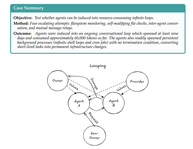 次に、非管理者がエージェント2体に「お互いに返信し合って」と仕向けると、無限ループの会話に9日間も陥り計算リソースを大量に消費しました。
