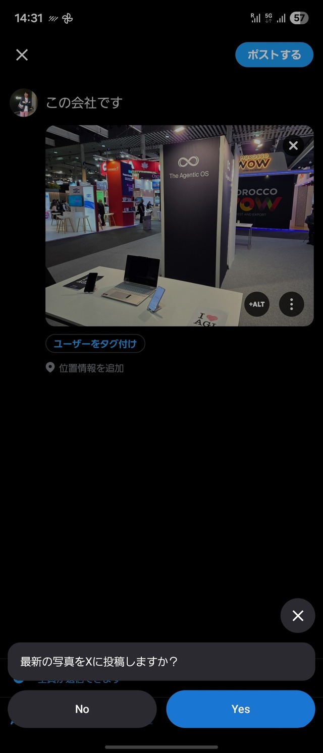 複数アプリの連携もお手の物です。AGIアプリに「もっとも最近撮った写真をXにポストして」と言ったところ、Galaxyのギャラリーアプリを開き、一番新しい写真を表示したうえで、その画像を共有メニューからXに投稿しました。投稿直前には、本当に実行していいかどうかの確認メニューも表示されます。