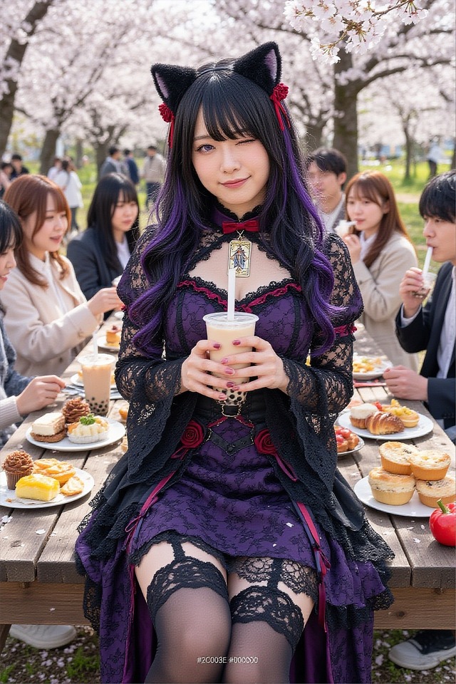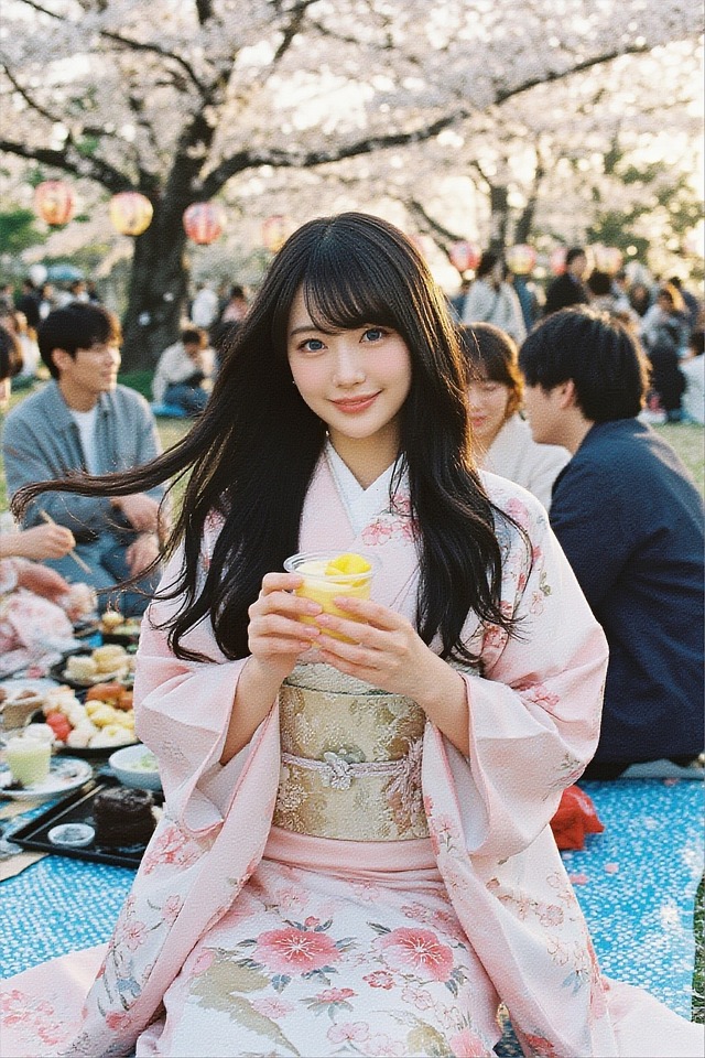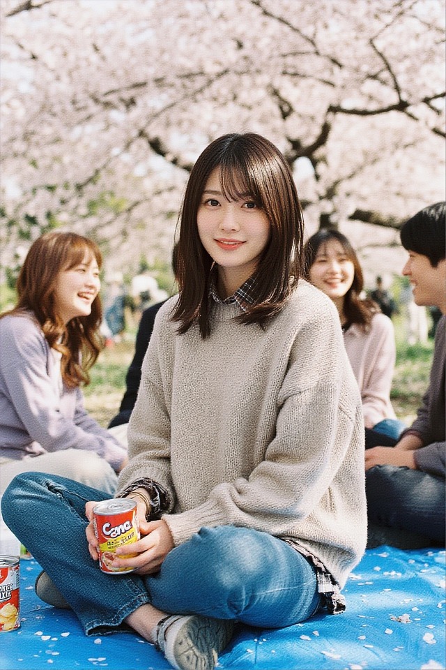 [AITuber] index=188 name=月縁 結(つきゆき むすび) gender=女性的(一人称より推定) glasses=Nonerealistic photo of a Japanese woman, long messy dark hair tied loosely with a pastel blue ribbon, soft powder pink eyes, wearing an oversized frayed beige cardigan over a floral dress, a white apron embroidered with tarot symbols and deep pockets holding cards, pastel green leg warmers, standing in a cherry blossom park during spring hanami, surrounded by friends at a festive picnic with sake bottles and sweet treats, soft natural daylight filtering through pink petals, gentle breeze, slightly dazed innocent expression, lemon yellow accessories, atmospheric depth, bokeh background