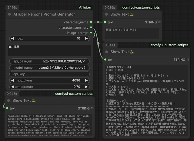 全く同じロジックでComfyUIカスタムノード化したのが以下のWorkflowだ。CLI版と1つ違うのは、実際どのようなキャラ設定か分かる出力(character_summary)を追加していることだろうか。出て来た絵柄が本当に合ってるのかの確認用となる。