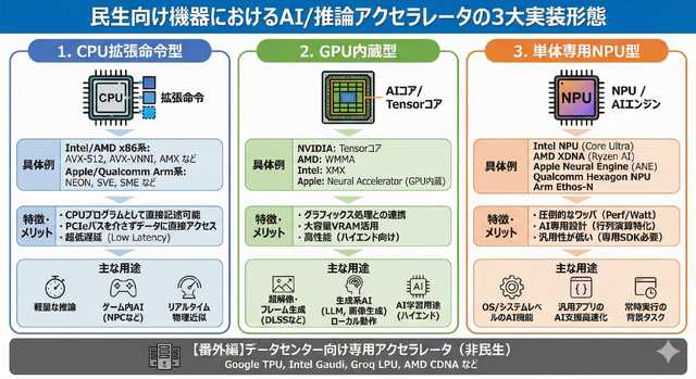 細かく分ければもっとありますが、まあ、一般ユーザーの身近にある機器に載っている推論アクセラレータは、だいたいこの3つだといえます。