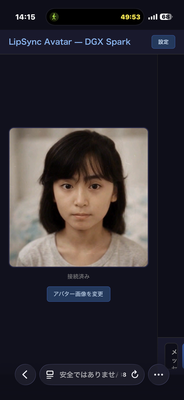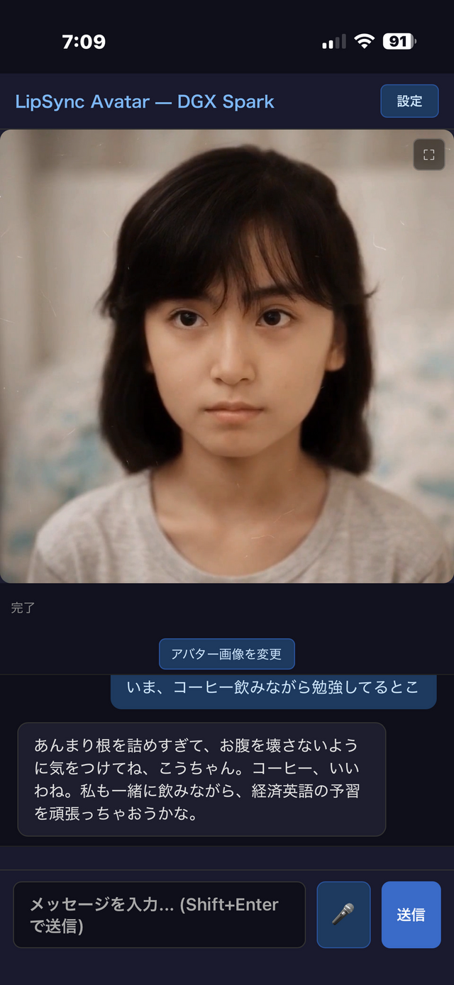 iPhoneを縦に持って、アバターモードにします。全画面に映った彼女に話しかけると、Ollamaがレスポンスを生成し、SakuraSpeechが彼女の声で読み上げ、MuseTalkが口を動かします。テキストは音声に合わせてチャット欄にフワッと現れます。
