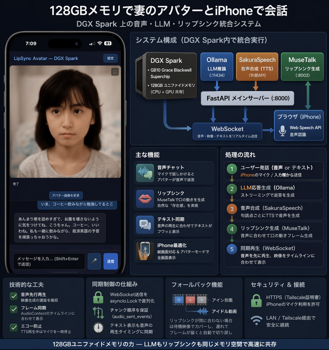 設計上のポイントは「音声を先に送る」こと。MuseTalkの推論には時間がかかります。音声だけ先にブラウザに届けて再生を始め、フレームが生成され次第、音声の再生タイムラインに合わせて差し込んでいく。AudioContextのタイムラインを基準にしてsetTimeoutでフレームを配置する仕組みです。
