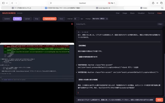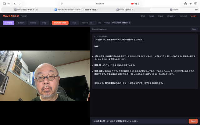 今回はGoogleが出したGemma 4を追加して、さらに独自開発エージェンティックAIのmazzaineoに「目」を与えた話です。カメラで映したものを説明させたり、別ウィンドウのアプリやブラウザの動作を解説させたりできるようになりました。