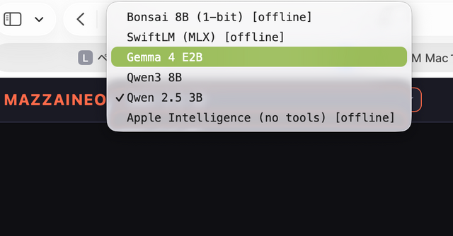 つまり、mazzaineoにとっての正解は「テキスト処理はBonsai 8B、画像が絡む処理はGemma 4 E2B」という使い分けです。Web UIのモデルセレクターからワンクリックで切り替えられるので、この運用は実用的に成り立ちます。とりあえず回答の品質はここでは問わないことにしています。
