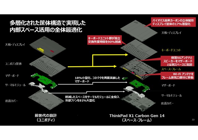 フラッグシップのThinkPad X1 Carbon Gen 14 Aura Editionには、2014年のユニボディ採用以来の革新という新筐体構造「スペースフレーム」を採用。