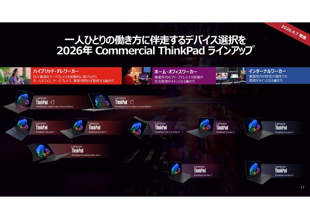 レノボ・ジャパンは2026年4月7日、ノートPC「ThinkPad」シリーズの最新ラインナップ全10モデルを発表しました。