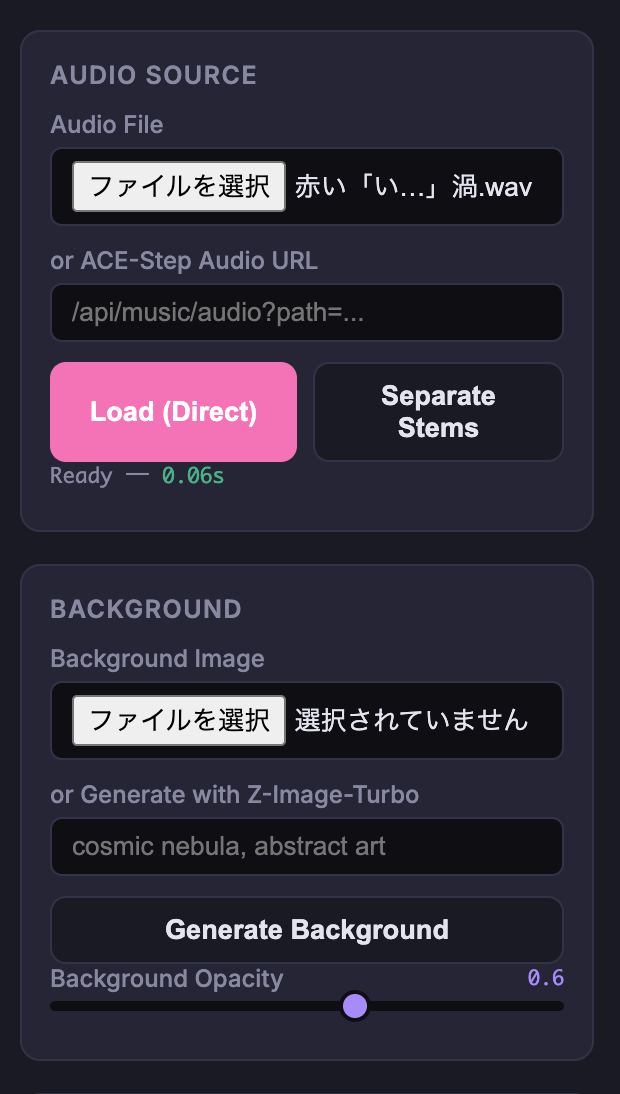 これで終わりにしようと思ったのですが、背景が真っ暗だなと思い、グラデーションを追加。Claude Codeが音に反応するようにしてくれました。いつまで経っても終わりませんな。こりゃ。