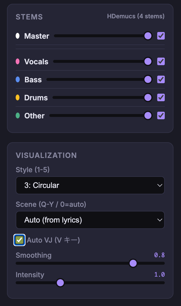 モード表示バッジが Stems セクションの右上に出るので、今どちらのモードか一目で分かるようになっています。