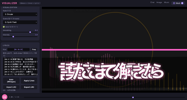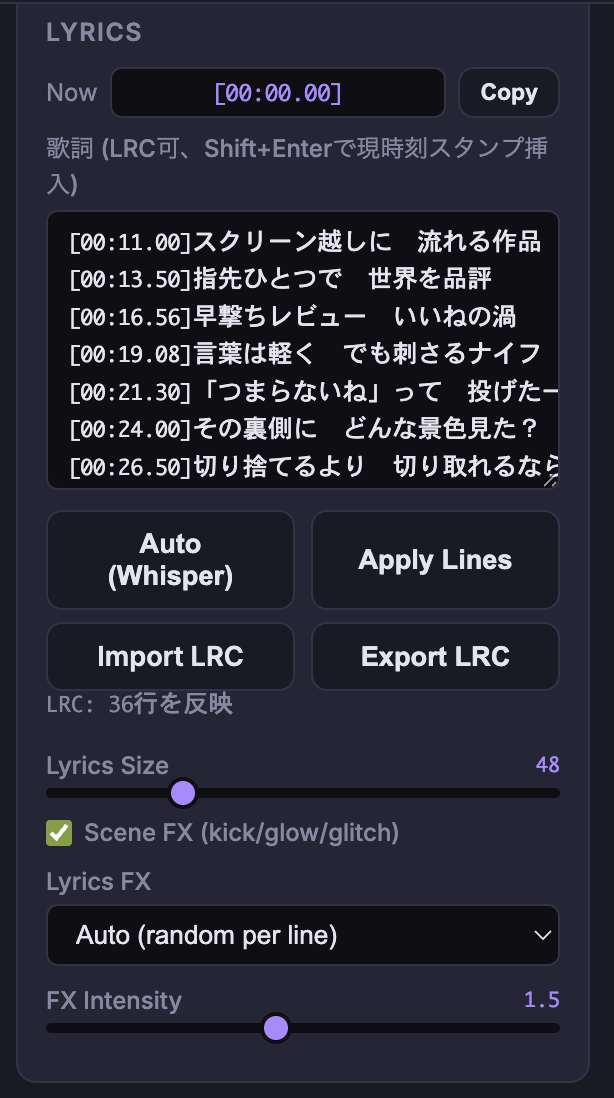 Auto (Whisper) で文字起こしすると、結果が `[mm:ss.xx]text` 形式でそのままtextareaに書き戻されます。個別行のタイムスタンプを直接編集できる。Apply Lines で再パースして即反映。Export LRC で保存、Import LRC で別の音源にも流用。