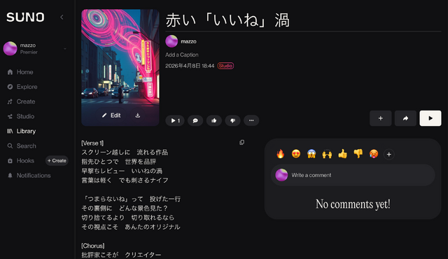 これをSunoのiPhoneアプリ版にそのまま与え、歌詞を仕上げてもらったら、けっこういい曲ができてしまったのです。