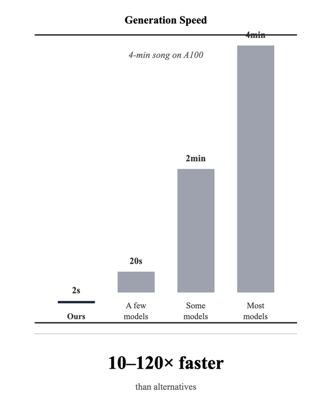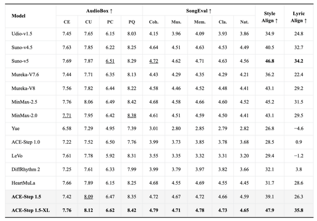 ベンチマーク結果によると、XLモデルは最高峰の商用モデルであるSuno v5をすべての評価指標において上回るトップスコアを示しています。