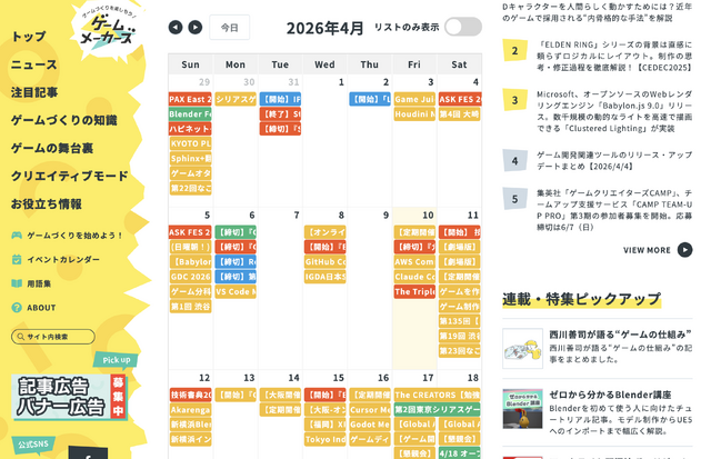 中でも特徴的なのが、イベントカレンダーで、ゲーム開発コミュニティ関連のイベントやカンファレンスの日程、アマチュアゲーム作品コンテストなどの募集開始/終了情報などが所狭しと紹介されています。