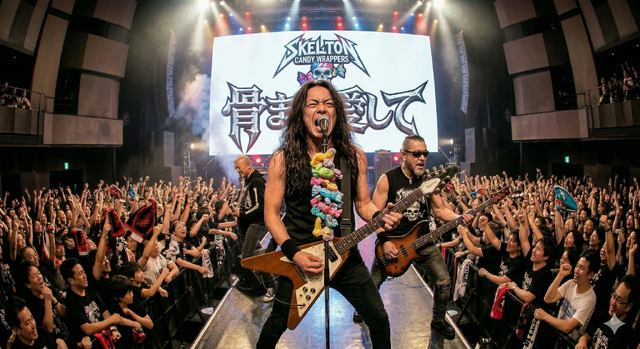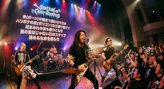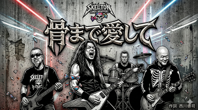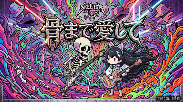 けっこう、本当にいそうなくらいのリアルな歌声のハードロックソングが出来たので、そのリアリティを強調するために、架空のロックバンド「SKELTON & CANDY WRAPPERS」を設定して、イメージキャラクタとロゴまで生成しました。