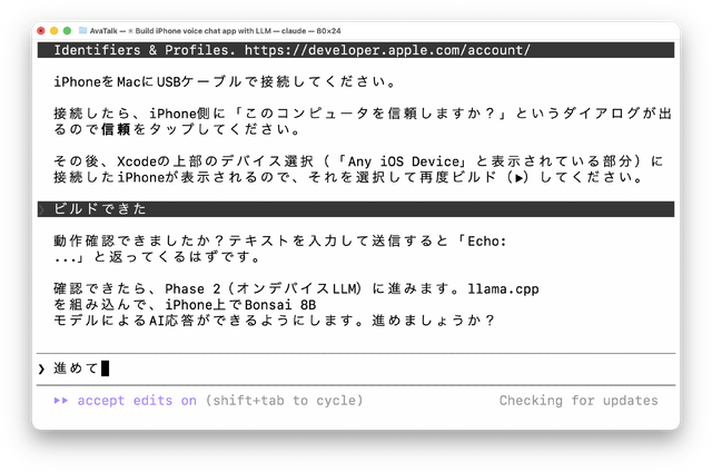 最初から完成品を書かせようとしない、Claude Codeの親心がありがたいです。だって、ビルドって何? みたいなところから始めてるわけですから。XcodeでビルドしたのをiPhoneに組み込むのってこんな簡単なんだってのも初めて理解しました。