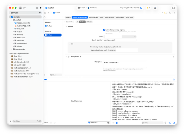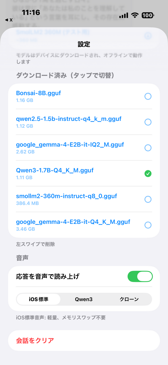 それでもボイスクローンのICLモードはMLXの作業メモリが大きすぎて、2GB空いていても落ちます。現時点ではiOS標準音声(あるいはQwen3-TTSの定義済みボイス)での妥協となりました。プリセットのボイスも不安定なので、結局iOS標準のKyokoに喋ってもらうことになりました。