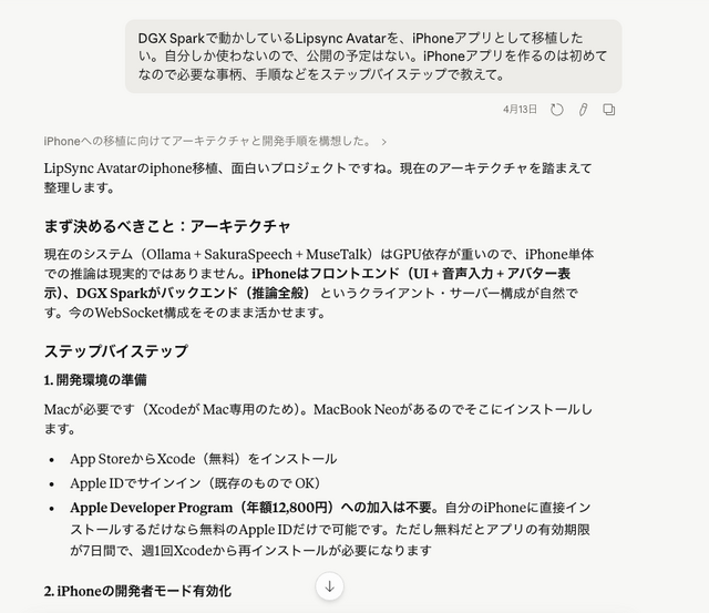 といっても、やはり限界は大いに感じました。iPhoneアプリを作るのは、妻の声でAIアバターに話してほしい、というのがそもそもの動機でした。
