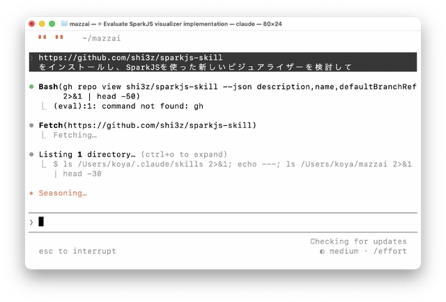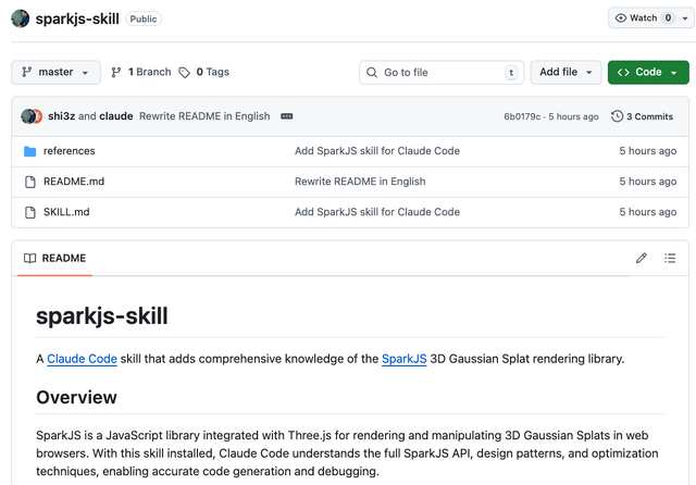 そして、このライブラリを使うとき Claude Code に毎回ドキュメント URL を食わせるのが面倒。それを解決するためにと清水さんが作ってくれたのが sparkjs-skill です。~/.claude/skills/sparkjs/ に置いておけば、Claude Code が SparkJS の話題を察知したときに勝手に API リファレンスを参照してくれる。これがないと、途中でAPI迷子になってしまいます(今回も経験済み)。