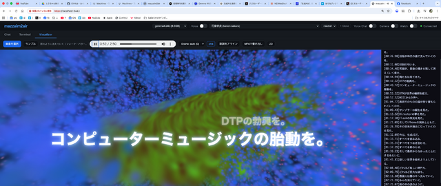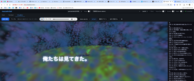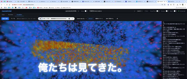 結果:3Dモードのまま再生→「MP4で書き出し」を押すと、歌詞付きの3D Gaussian Splat ビジュアライザー動画が降ってくる。