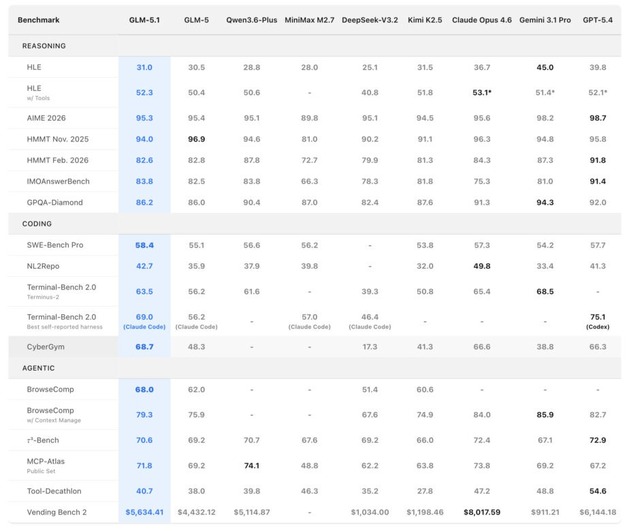 総合ベンチマークを見ると、推論系ではGemini 3.1 ProやGPT-5.4がリードする分野も多く、GLM-5.1が全方位で最強というわけではありませんが、コーディングやサイバーセキュリティといったタスクでは実力を示しています。
