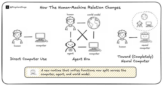 AIが単にツールを操作する段階から、計算、メモリ、そして入出力をひとつの学習された実行環境(ランタイム)に統合する「ニューラル・コンピュータ」(Neural Computers、NC)という全く新しいマシンの形態がMetaなどの研究者らから提唱されました。