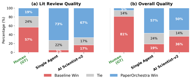 比較評価の結果、PaperOrchestraは文献レビューの質においては50%~68%、論文全体の質においても14%~38%という高い勝率マージンを達成し、より人間に近い高品質な論文を作成できることが実証されています。