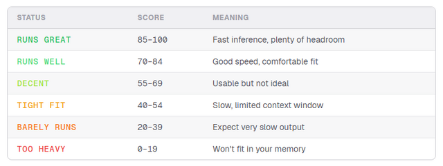 仕組みとしては、WebGL・WebGPU・navigatorの各APIでGPU名・CPUコア数・搭載RAMを取得し、約40種類のGPUおよびApple Silicon約12種類の内蔵データベースと照合することで、VRAM容量やメモリ帯域幅を推定します。そのうえで各モデルの量子化別VRAM要求量を計算し、推論速度55%、メモリ余裕度35%、品質ボーナス約10%の配分で0から100点のスコアを算出する仕組みです。