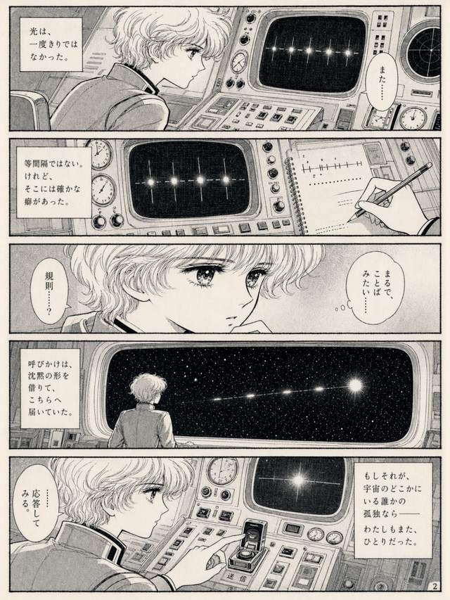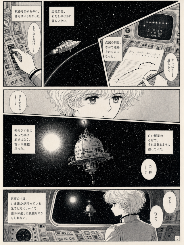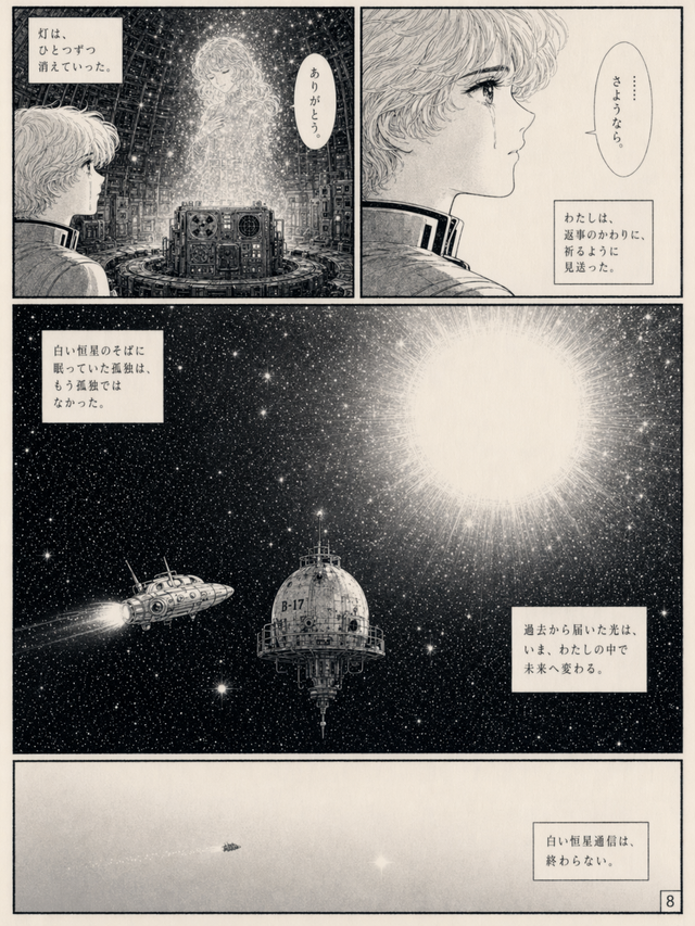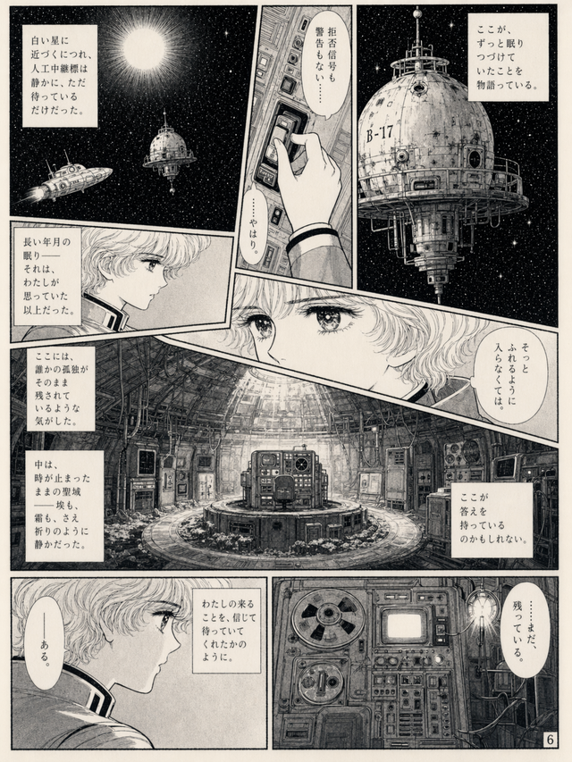 1976年に公開されたSF少女漫画です(後付け設定)。作者は天城 玻子(あまぎ はこ)。花の24年組の流れを汲む、1952年、横浜生まれ。『白い恒星通信』でデビュー(1972年、『週刊ラララ』新人まんが賞準入選作として掲載)。というような設定は、16ページ生成した後で作りました。