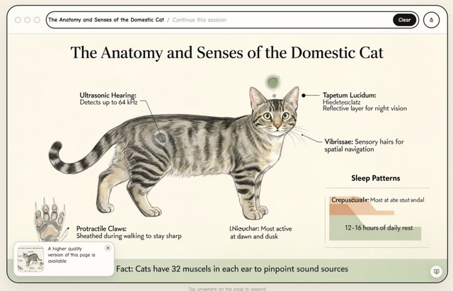 このシステムでは、画面に表示されるすべてのページが1枚の画像として構成されています。画像の中の気になる部分をクリックすると、その対象をさらに深く掘り下げた新しい画像が次々と生成されます。表示されるものにはHTMLもコードもなく、特定のリンクや入力フィールドも存在しません。Web全体の情報が、画面上のピクセルとして生成される仕組みです。