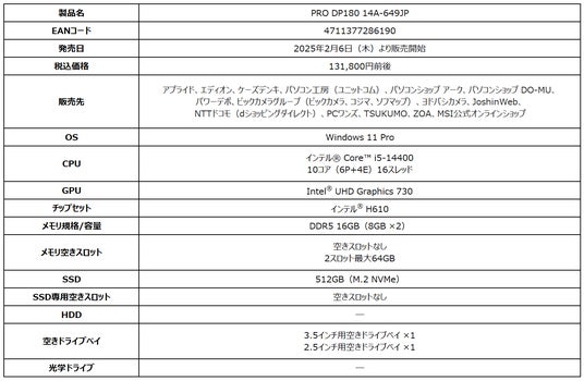 この度、エムエスアイコンピュータージャパン株式会社は2025年2月6日(木)よりビジネス向けデスクトップPCブランド『PRO DP』シリーズより、第14世代インテル(R) Core(TM) i5-14400、大容量メモリ、超高速SSDを搭載し、ビジネス用途に最適なWindows 11 Proプリインストール済みモデル「PRO DP180 14A-649JP」が新たにラインナップに加わります。