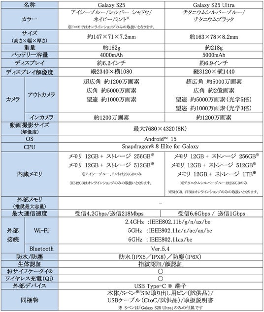 <主な仕様:「Galaxy S25」、「Galaxy S25 Ultra」>