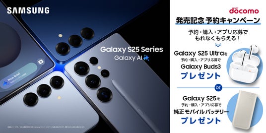 対象期間中に全国のドコモショップ、ドコモ取扱店、ドコモオンラインショップ、ahamoサイトにて「Galaxy S25 SC-51F」「Galaxy S25 Ultra SC-52F」を予約・購入・応募いただくと、Samsung純正モバイルバッテリーやGalaxy Buds3を無料でプレゼントいたします。