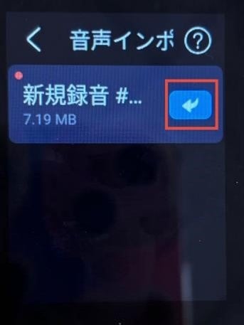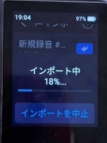 1. 付属のUSBケーブルでPCと接続し、「音声インポート」、青い矢印を順にタップ。