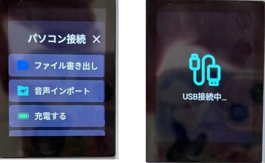 1. 付属のUSBケーブルでPCと接続し、「音声インポート」をタップ