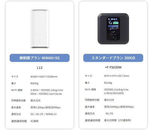 「WiMAX+5G無限制プラン」と「スタンダード300GBプラン」の選べる2プランをご提供いたします。