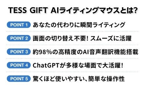デスクワークにおける多言語翻訳のよくある悩みを徹底調査し、それを見事に解決したのが、このTESS GIFT AIライティングマウスです。