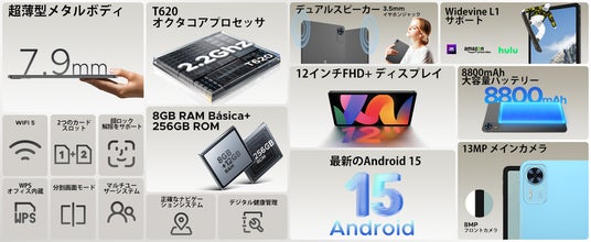 ・大容量バッテリー:8800mAhのバッテリーにより、長時間の使用が可能で、10Wの急速充電にも対応しています。